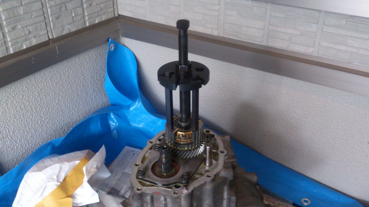 仕方ないので、手持ちのプーラーとS氏さんに借りたプーラーの合わせ技で、さらにara_Rジャッキのパイプも駆使して、こんな感じで2速・3速取り外し成功(笑)。
