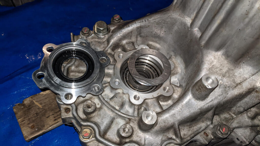 インプットシャフト・アウトプットシャフト・シフトフォークをケースに突き立てるところで、ちょっとミスってアウトプットシャフトをゴトンと落としたりもしたけど、リバースの玉っころに注意しながら突き立てて、ケース2段目を閉じて、ついでなのでデフのサイドのシムを手持ちの中で一番厚いやつにしてやった。