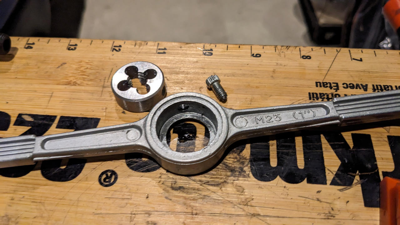 小型とは言えそれなりにゴツイ万力、割れたやつよりは断然剛性があって、咥えてるスタビリンクが外れる頻度は格段に低く、ようやく2本目のネジ切りが完了して、調整式スタビリンクが1本完成。