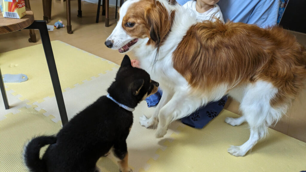 ウチの子しょっぱな脱糞までしてたくせに、先輩ワンコ、タジタジである。