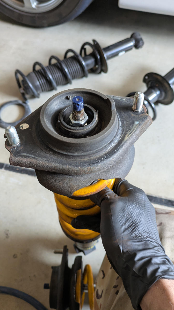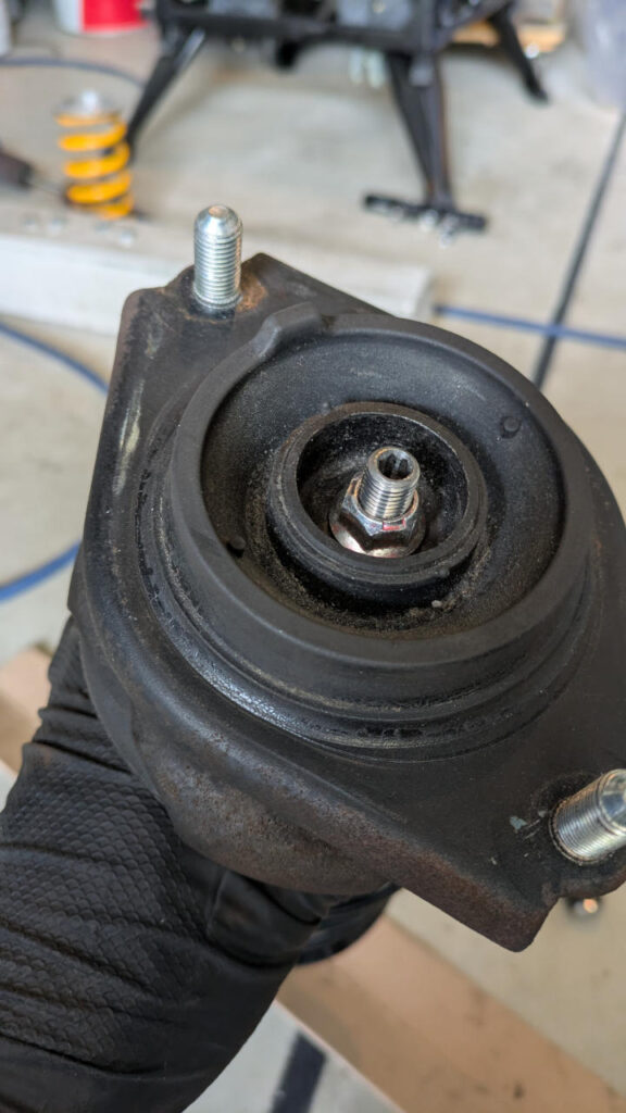 すっかり忘れてたが、リアのアッパーマウントは純正のを流用してる(真ん中のボルト穴を拡大して再利用)ので、純正ショックに付け直さないといけない。車高調から外すのはバネを遊ぶぐらいロワシートを下げてやればいいだけだけど、問題は純正ショックに取り付ける方。
