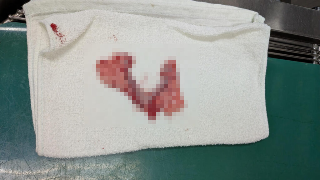 ついでに摘出されたブツも見せてもらった。うむ、モツだ。