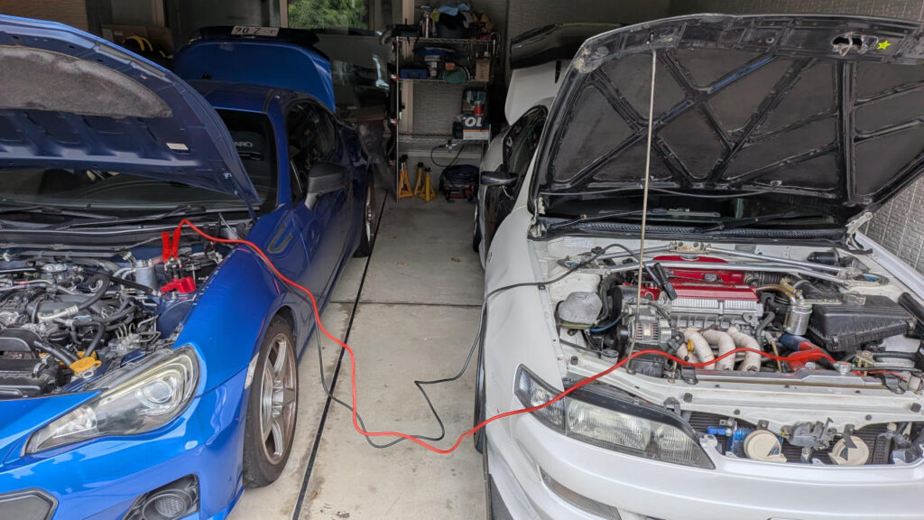 先週洗車するときもバッテリー上がってて、そろそろ買い替えかなあと思っていたけど、まさかこのタイミングで、ジャンプスタートしてしばらくエンジン回して充電しても、一度エンジン切ると次にかけるときには「キュル・キュル・キュル・キュ・・・カチカチカチ…」