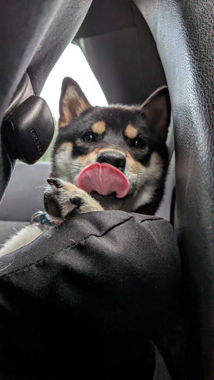 帰りの車内にて。さすがに疲れたのか後部座席で大人しくしてた。