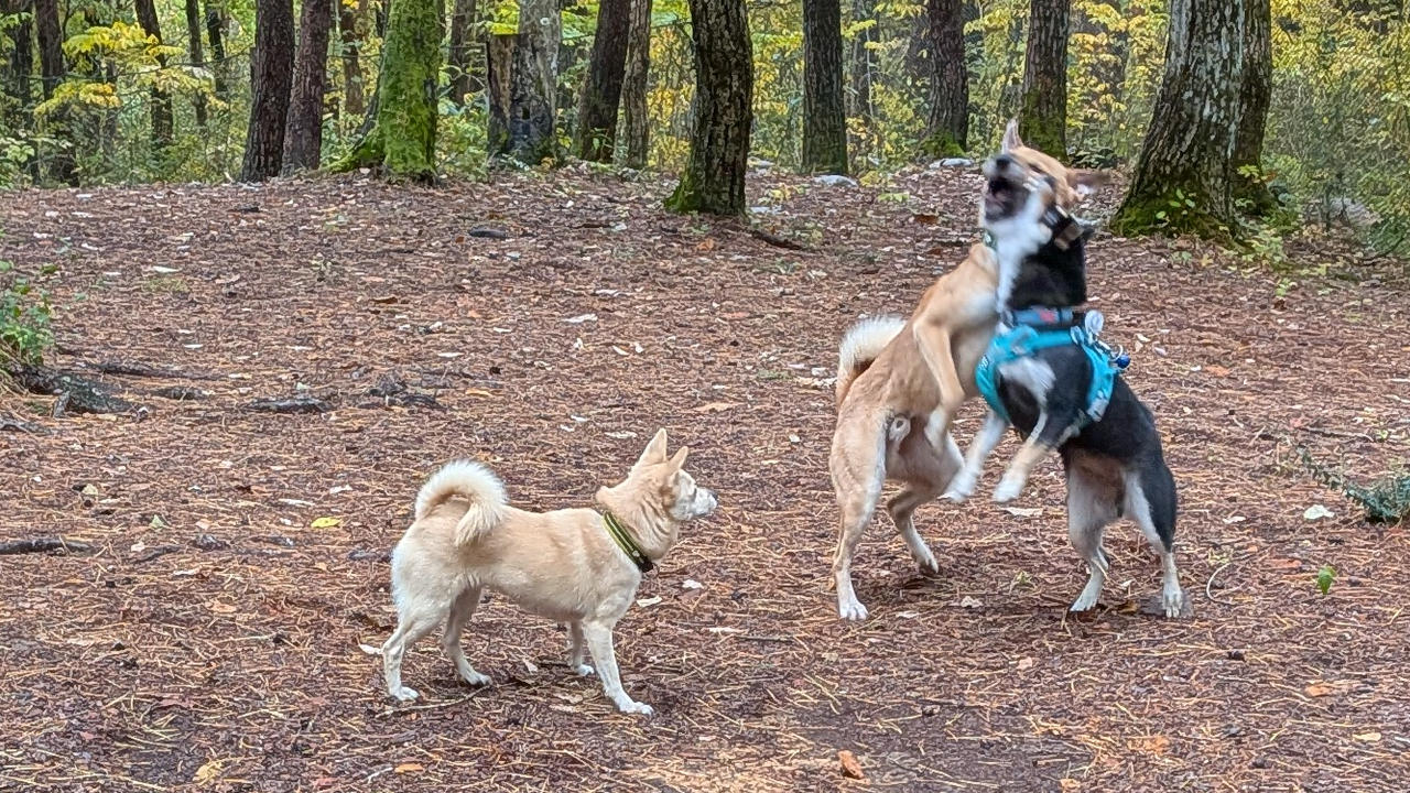 昼メシ後は何匹か他のワンコも合流してきて、ひと回り大きい子に結構しつこくされてたけど、負けじとガウガウ。
