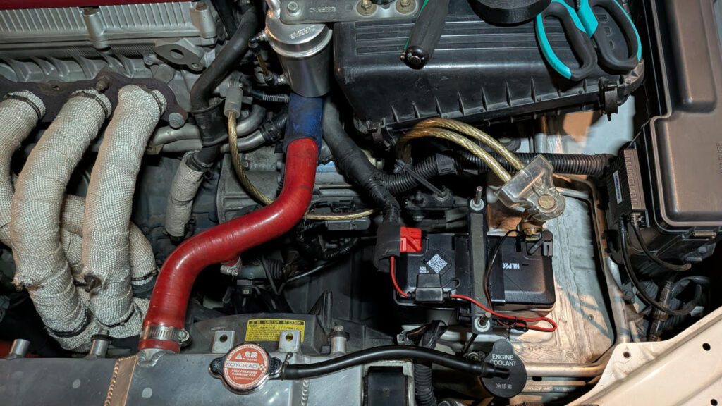 と言っても、バッテリートレイや純正のステーは捨ててしまったので、昔トランクにドライバッテリーを置いてた頃に使ってたバッテリーステーを使って無理やり固定。純正時代はどうやって固定してたんだっけな??もはや忘却の彼方…。