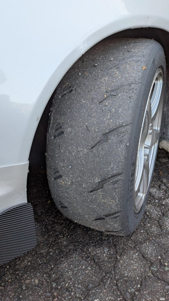 以前シバ200Tでひどい目に遭ったので恐る恐るペースを上げていったら、柴Sはすぐに食うようになってリヤのRE-71RS (235/40R17)が完全に負けてる。夏プレミアム獲れたぐらいだからまだイケるだろうと思ったんだけど、結局またひどい目に遭ったw。2年近く使い続けた71RSは溝はまだあるけど終了かな…。