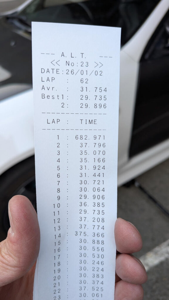 しかし、連続周回してもタレは感じないんだけど、一発のタイムが出ない。。。休憩を挟みつつ、最終的に1枠で62周も走ってレシートが2枚に分かれてたけど、ベストは11周目の29.735だった。