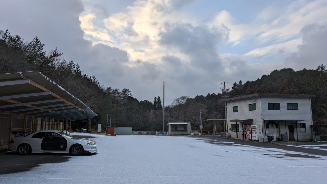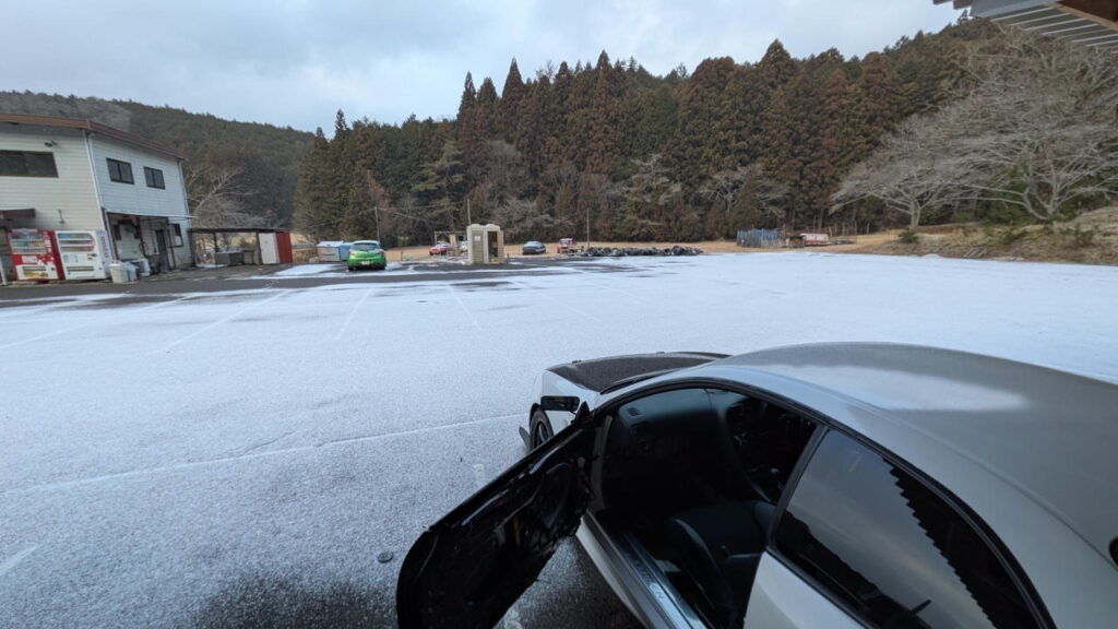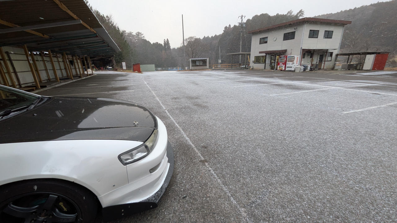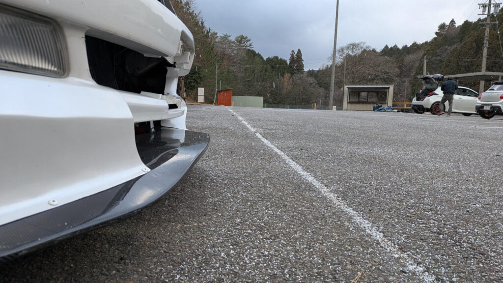 走行後、めんどくさいからSタイヤのまま帰ろうかと思ったら、雪降ってきた。うっすら積もり始めてるし(汗