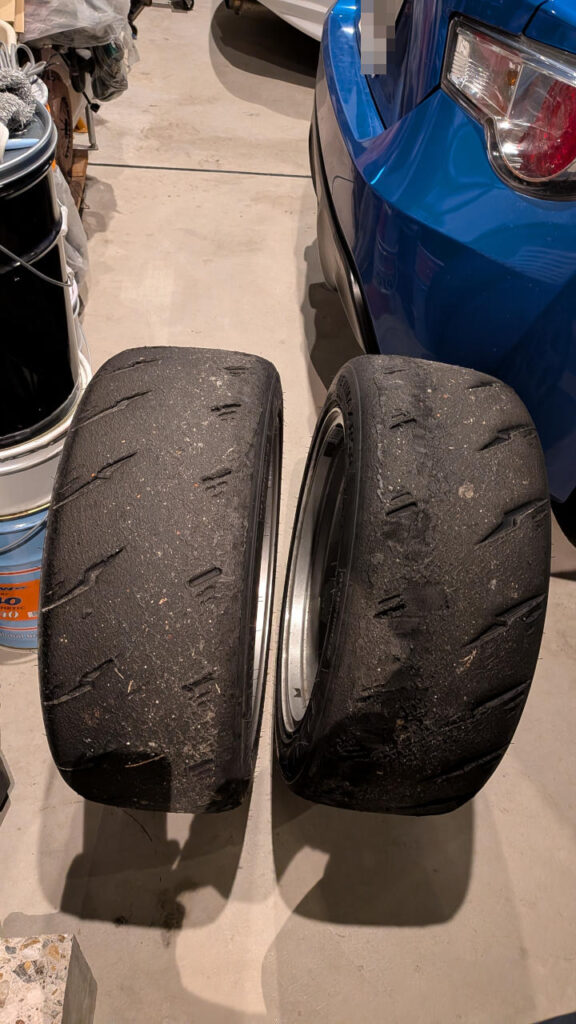 初めて4輪使ったSタイヤは、特にリヤは一丁前にタイヤカスがベッチョリ。(フロントはFFでひたすら猿走りしてたおかげかあんまり付いてなかった)