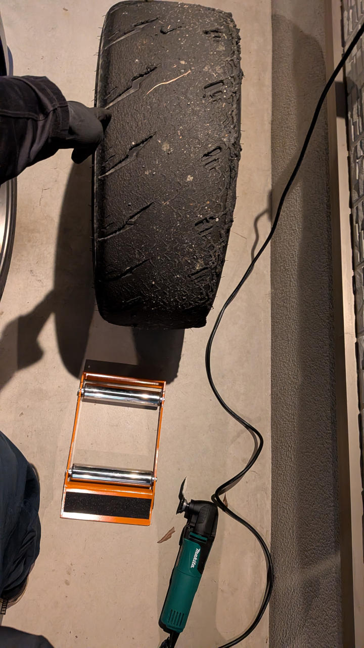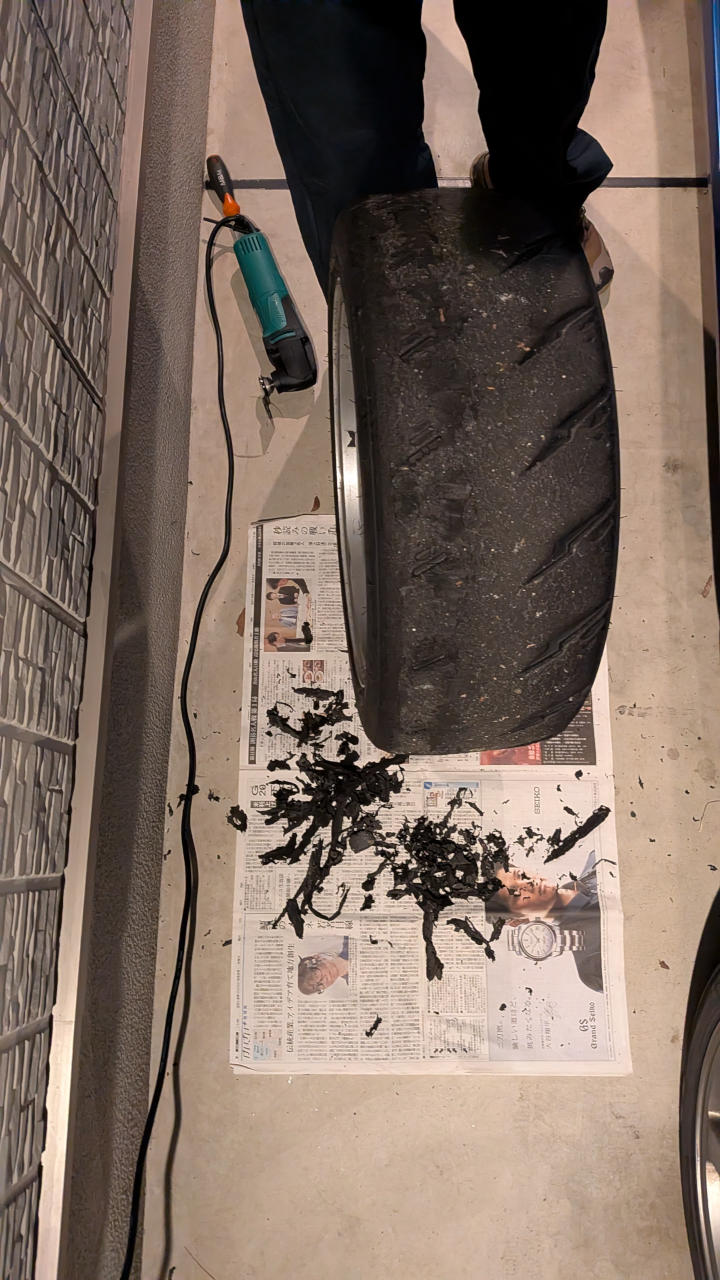 案の定、角度や力加減などコツのいる作業で、ローラーがあっても意外と姿勢が辛く、まあまあしんどいぞコレ…。そして角度ミスると生きてるタイヤを削ってしまう(汗