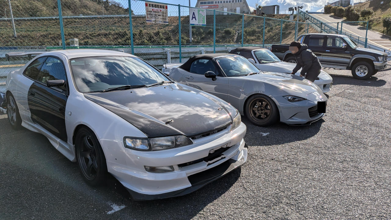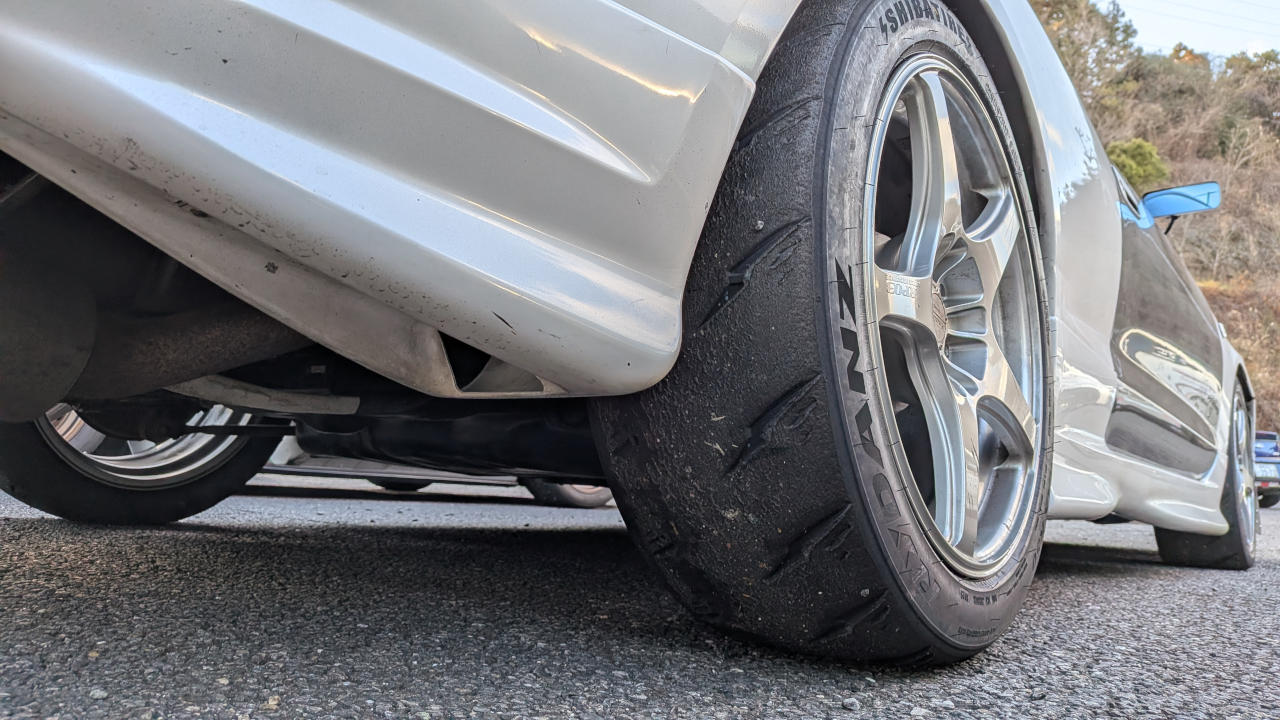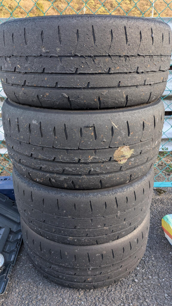 で、タイヤはシバS R50 T5β 225/45R17。しかし、次のカート枠のうちにタイヤ交換が終わらなくて、4輪枠を1枠見送って、日が傾き始める4輪最終枠で走行。