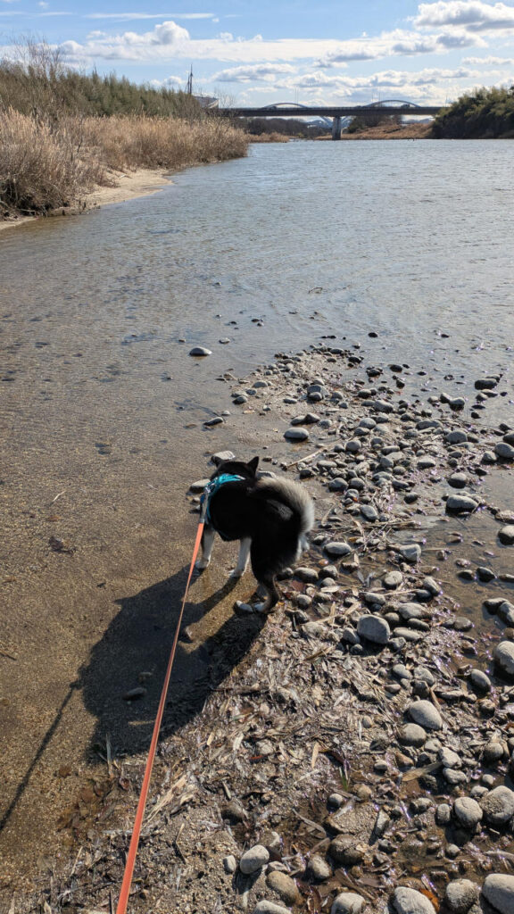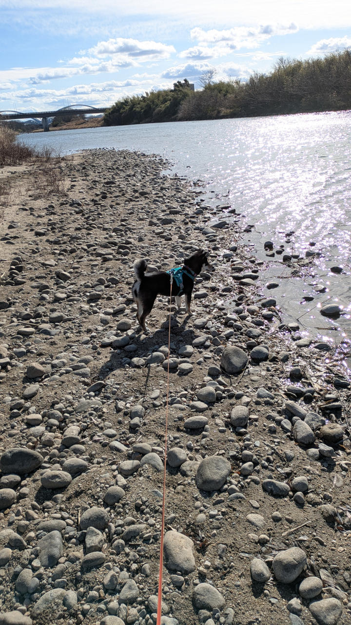 一方その頃黒柴は、ラリージャパンのSSSやってたエリアの近くまで行ったり、河原に降りてみたり。水嫌いなくせに浅瀬に進入してちょっとビックリ。