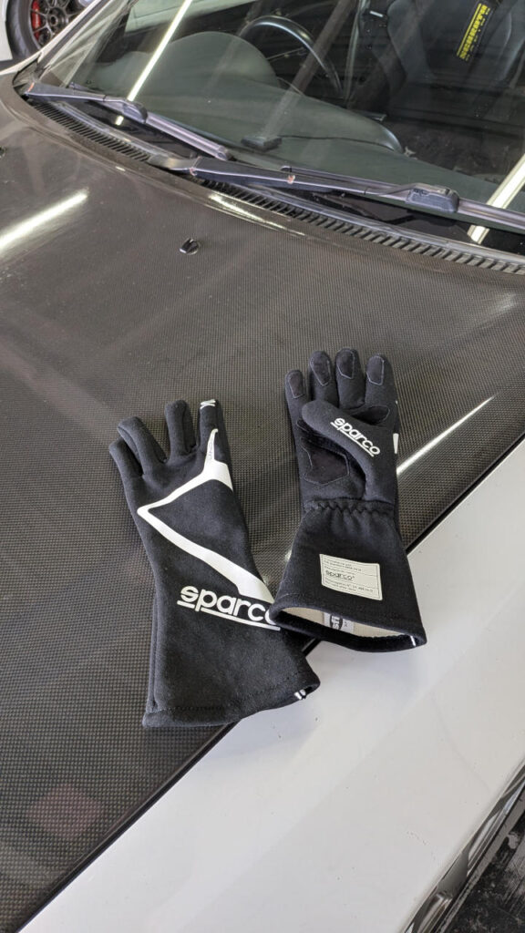 あと、本日のニューアイテム。グローブを新調した。今回はちゃんと四輪用のFIA認証のあるやつ。レーシングスーツを着てるわけでもないのに、手だけ難燃性で意味あんのかと思うけど、生地が厚めで丈夫そう。ステアリングのグリップ感は、前のカート用のラバーと比べるとちょっと滑るけど、前のはグリップしすぎて手首痛めそうだったから、これぐらいでいいんじゃないかな。