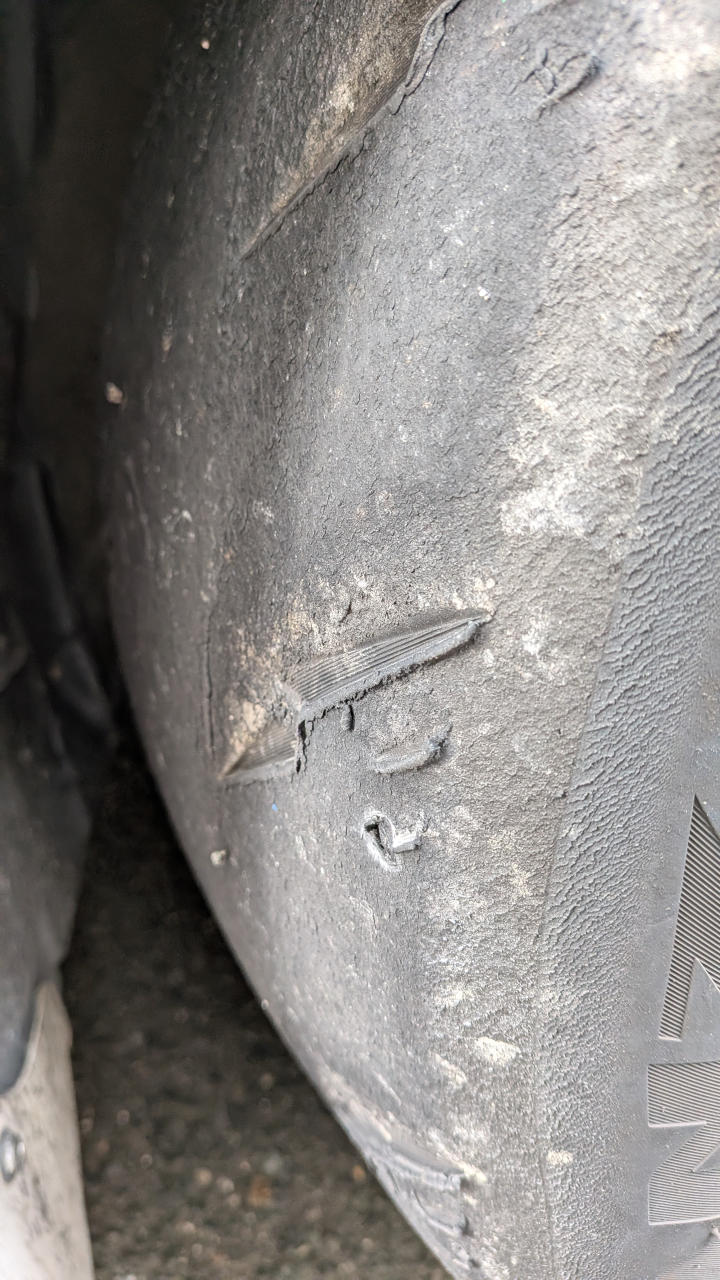 あと、フロントはカミナリ型の溝もエッジが片側だいぶ削れてた。まあ、このタイヤは仮に新品だったとしてもウェットは捨ててるようなタイヤだから、溝がなくなってもドライ限定でグリップしてくれれば十分かな。RE-71RSは溝残ってるのに賞味期限切れちゃったみたいだから、柴Sは新鮮なうちに使い切らないとな。