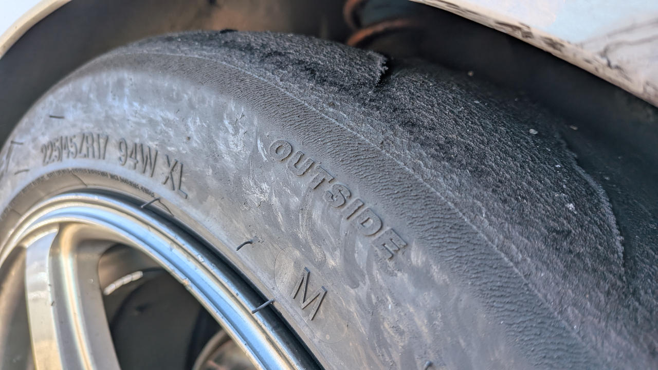 そういえば、上に書いたようにタイヤの空気圧は温間でフロント1.8kとかで走ってるんだけど、よく見てみたら、ショルダーと言うか側面を結構使ってる。”OUTSIDE”の文字の上の方が削れてた。そんなにアンダーを出してる自覚はないんだけどな。空気圧低い状態で横グリップ目いっぱい使ったらタイヤがよれるのかな。