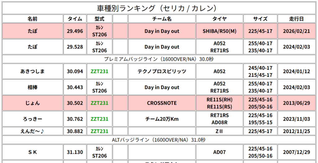 車種別ランキングも更新して無事にSタイヤでラジアルのタイムを上回ることができた。