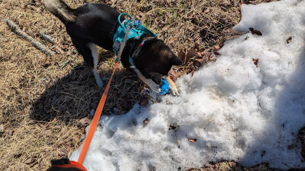 一方その頃黒柴は、残雪の上でボールをこねて遊んだり、
