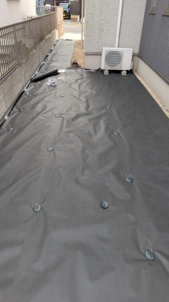 防草シートはピンを打ち込んで地面に固定したけど、壁際は地下の意外と浅いところにコンクリートが埋まってて、ピンが刺さらないことがあったりして地味にメンドクサイ。