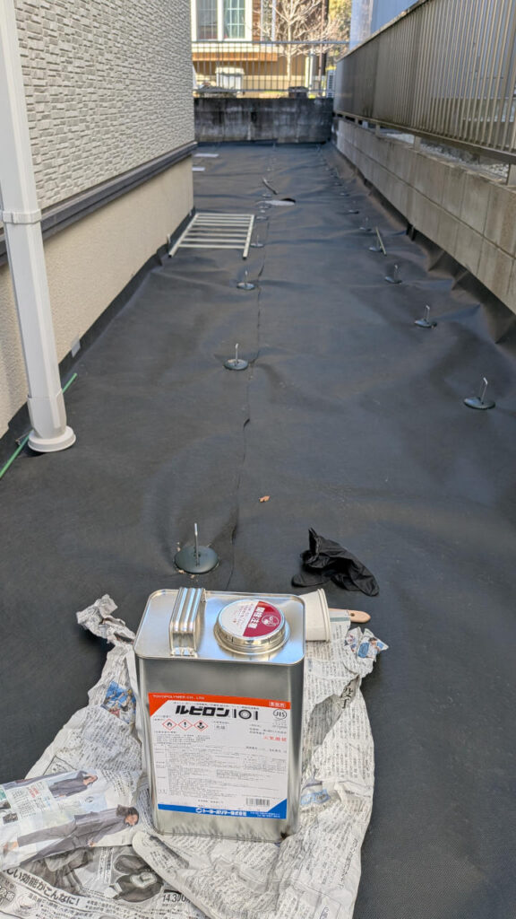 防草シートの重なり部分や壁との接合部は屋外用の接着剤を使用(FRP工作や塗装のおかげで、こういうデカい化学薬品を買うのに躊躇がなくなってきているw)。ドロッとしたパテ状の接着剤で、対象物の両面に塗って15分ぐらい放置してから貼り合わせよ、とのことだけど、放置して固まりかけの状態になったもの同士を貼り合わせると、ネッチョリしてかなり強力にくっつく。(ゴムっぽく固まるのかと思ったら、後日完全に固まったものを触ってみたらカチカチだった。中途半端にはがれかけてツララ状に伸びたところが尖って痛い…)