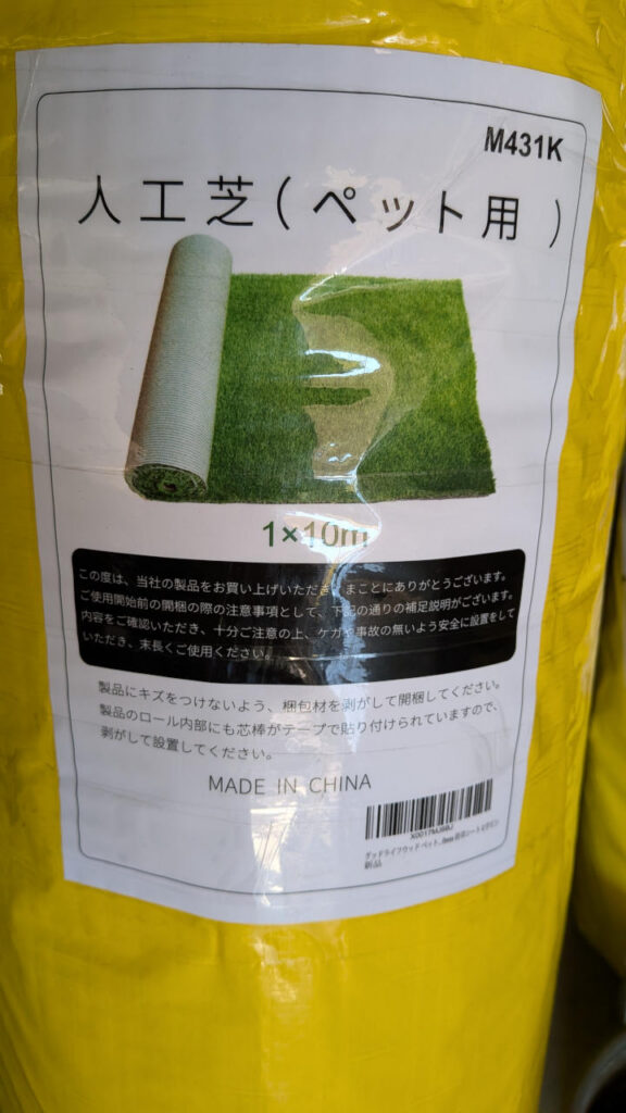 そしてようやく人工芝の登場。「ペット用」と謳ってるものを用意してみたが、人工芝って地味に高いのね。これでも価格帯としてはミドルレンジだろうか。ペットの親バカターゲットで割高かもしれんけど、抗菌を謳ってるものは意外と少ないのでまあ良しとする。