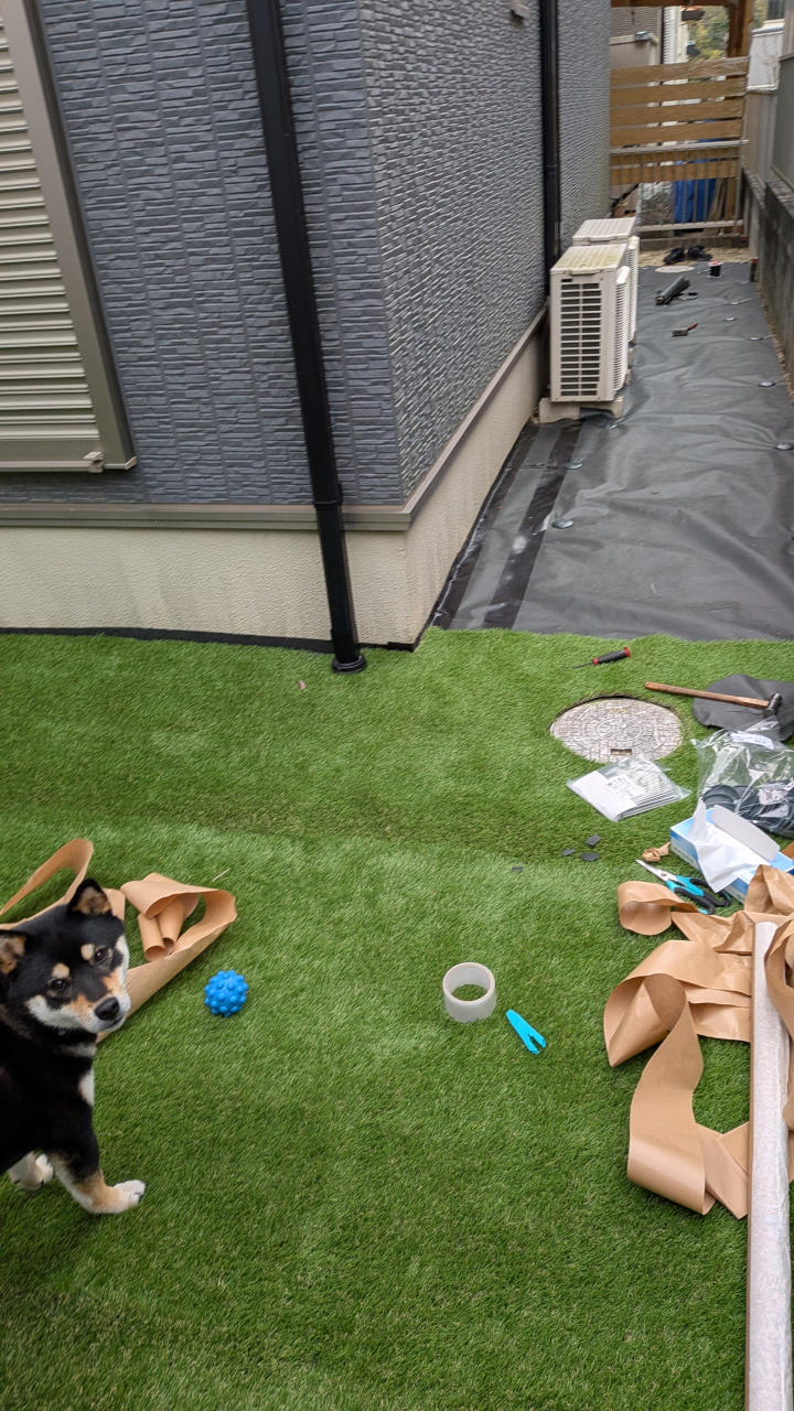 そして人工芝も、北側の最後もう一息ってとこまで。人工芝は1m幅×10m×4本買ってたけど、後どんだけいるかなあ。