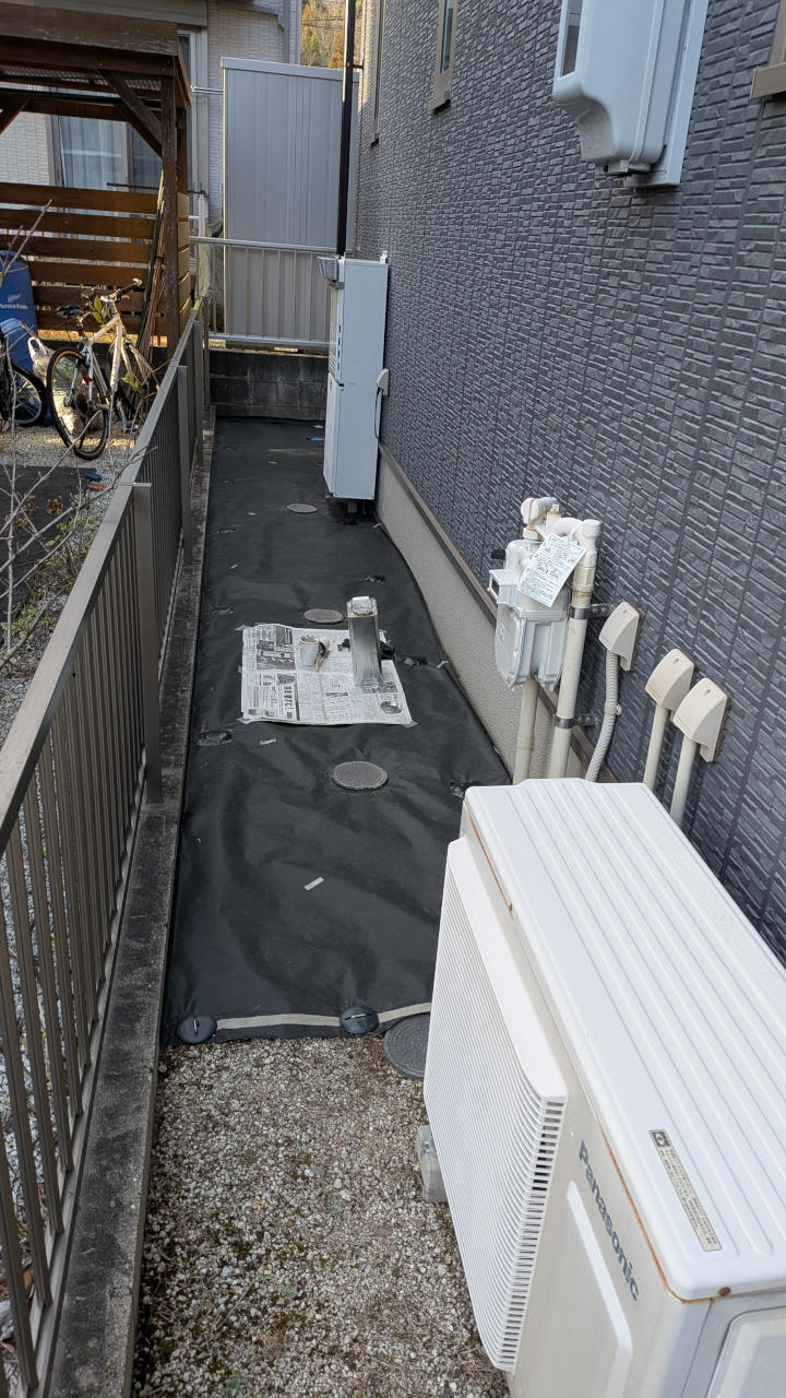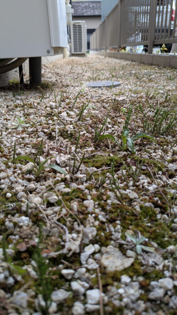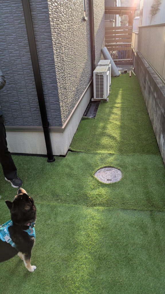 前回ブログに書いたのは敷地の北東側の裏庭部分と南側に出る通路部分。BRZのユーザー車検をこなした昨日の午後と今日、北側の通路部分と西側の通路の北3分の1ぐらいに防草シートを敷いて、北側に人工芝を敷いた。