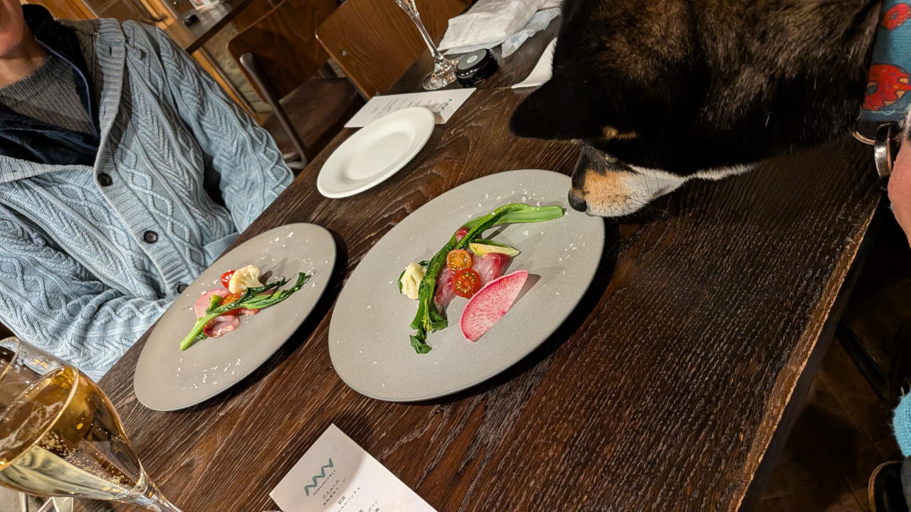 途中、眠そうにしてたけど、メインの肉料理が出てきたら目覚めたw。料理はどれも絶妙な味付け。