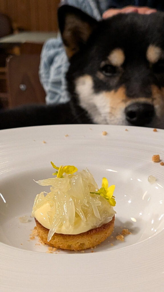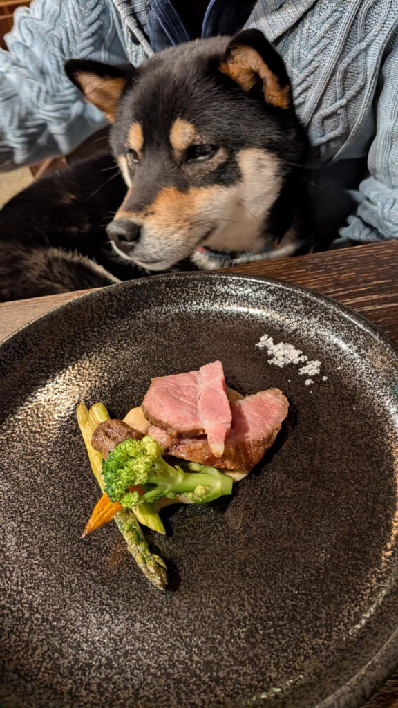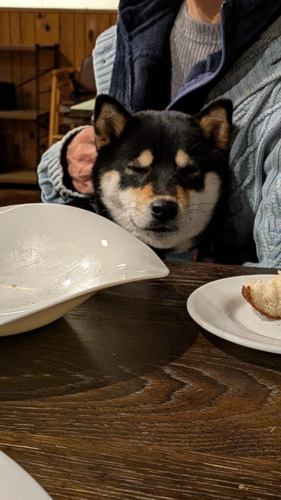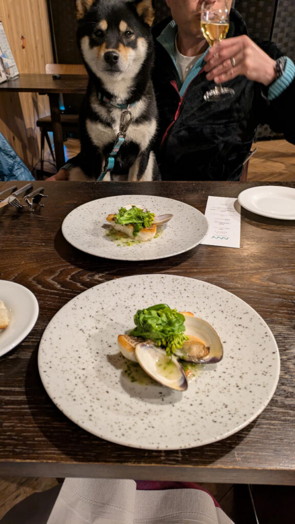 晩飯は、シャトルバスで移動して、ワンコ同席可のイタリアンでコース料理。抱っこしてみたら意外と大人しくしてた。