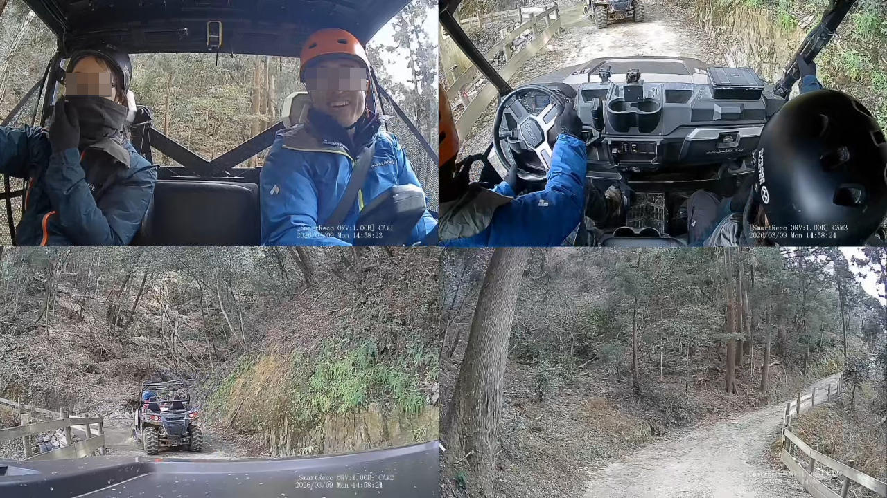 ダッシュボードに2つカメラが付いてるのは気付いてたけど(映像左側)、それ以外に2つ(天井・後方)も付いてたとは思わなかった。後方は、複数台で参加してる場合は面白いかもね。