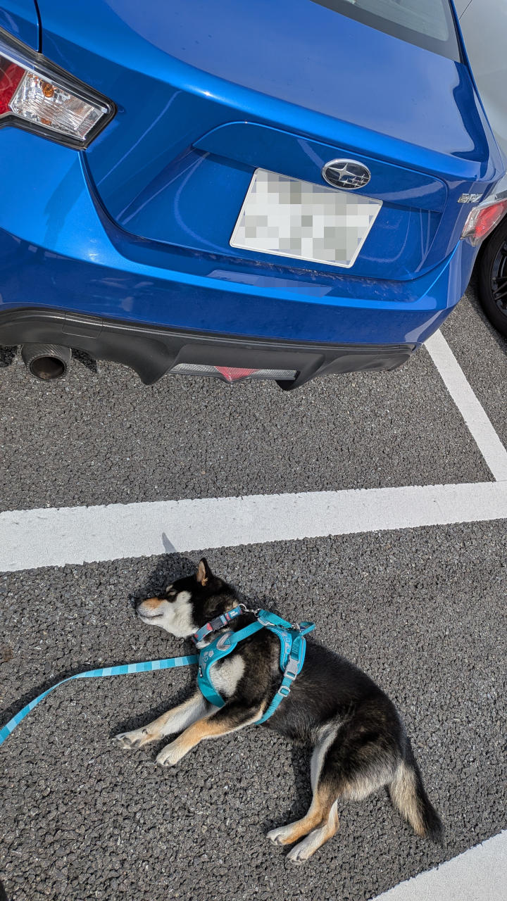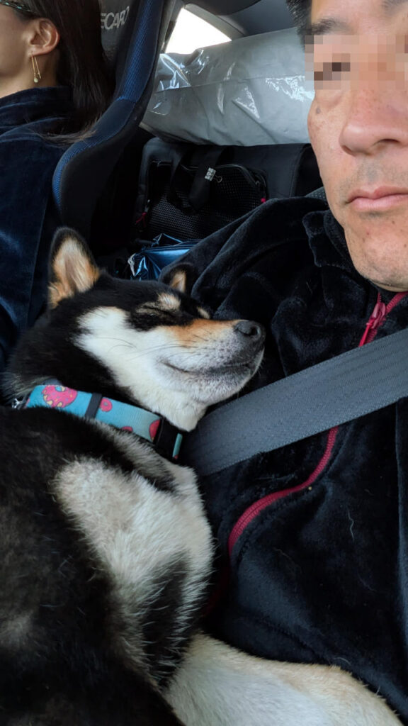 そんなこんなで荷物を車に積み込んでいると、いつの間にか電池切れたのかワンコは爆睡。