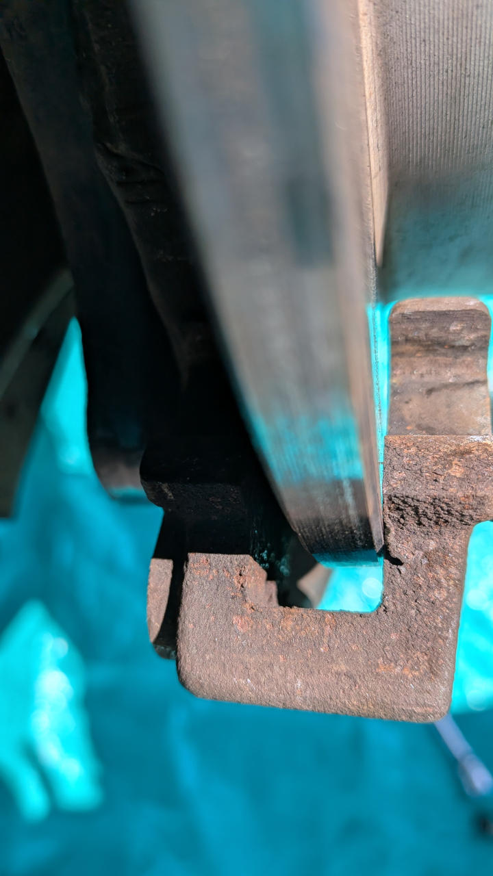 確かに、キャリパーを取り付けるときにボルトがイマイチ入りにくいな、とは感じてたけど、ハブがもげてキャリパーが割れるまでの間に、タイヤホイールを引きずりながらローターでキャリパーに強い力が掛かり続けて、キャリパーを取り付けるブラケットが曲がってしまったようだ。