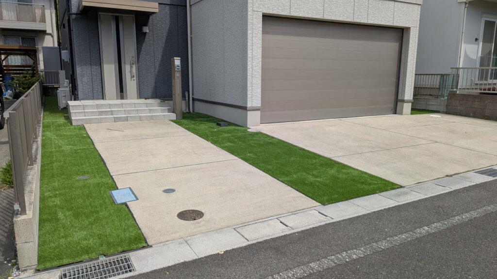 年末年始ごろから草むしりに着手して、地道に防草シートと人工芝を敷いてたけど、ようやく敷地内の土を人工芝で覆いつくすことができた。長かった。。